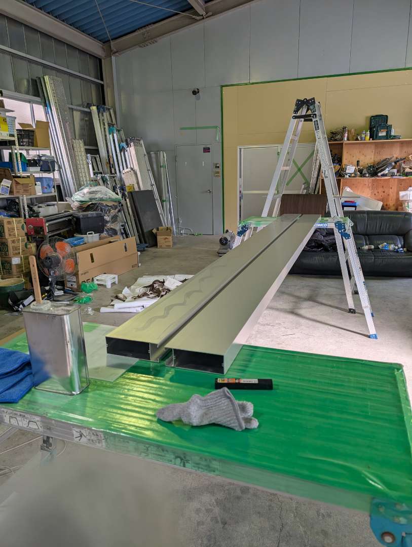 ルーバー70本・小口蓋70本のアルミルーバーのシート貼りを作業場にて施工致しました。